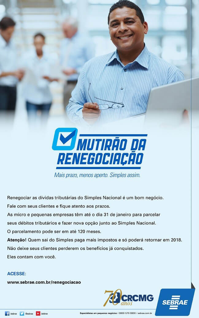 As micro e pequenas empresas têm até o dia 31 de janeiro para parcelar seus débitos tributários e manter sua opção ao Simples Nacional. Acesse: www.sebrae.com.br/renegociacao